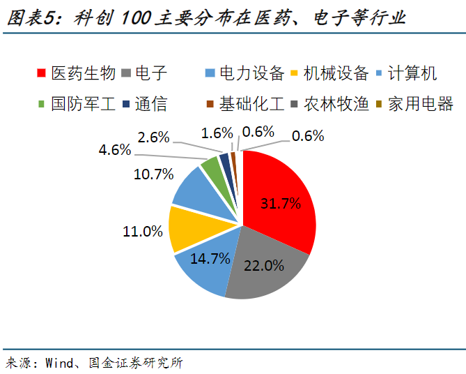 国金证券指出,科创100分布较为均衡,主要聚焦于三大成长领域。截至2023年11月22日,一级行业来看主要分布在:医药生物(31.7%)、电子(22.0%)、电力设备(14.7%)、机械设备(11.0%)和计算机(10.7%)等具备高成长属性的行业,合计占比高达90.1%;二级行业来看主要分布在:半导体(18.1%)、医疗器械(11.7%)、生物制品(9.7%)、电池(8.4%)等,代表着数字经济、自主可控以及能源转型等未来产业发展方向,TOP9行业合计占比高达74%。相较电子成分股占比超50%的科创50来说,科创100的行业分布较为均衡,不易受到单一周期的影响,或更容易受到均衡配置型资金的青睐。