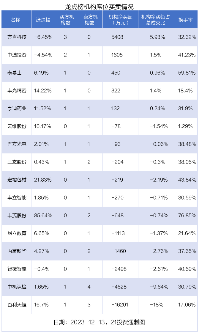 12月13日,16只个股龙虎榜出现了机构的身影,机构合计净卖出1.95亿元。具体来看,机构净买入5股,净卖出11股。
