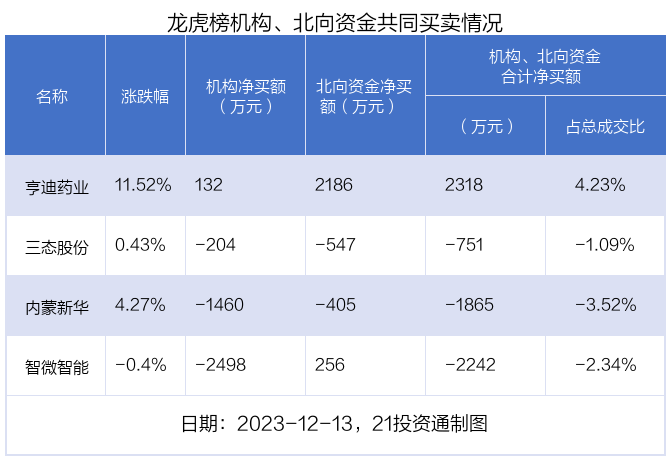 值得注意的是,机构和北向资金共同净买入了亨迪药业等1股;共同净卖出了内蒙新华、三态股份等2股;在智微智能上出现分歧,机构净卖出智微智能2497.76万元,北向资金净买入255.53万元。
