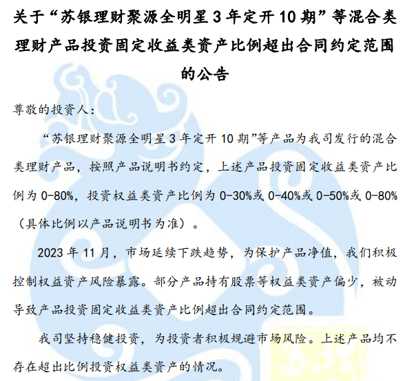 12月4日,苏银理财公告部分混合类理财产品投资固定收益类资产比例超出合同约定范围。按照产品说明书约定,苏银理财混合类产品投资固定收益类资产比例为0-80%,投资权益类资产比例为0-30%或0-40%或0-50%或0-80%(具体比例以产品说明书为准),公告称:“2023年11月,市场延续下跌趋势,为保护产品净值,我们积极控制权益资产风险暴露。部分产品持有股票等权益类资产偏少,被动导致产品投资固定收益类资产比例超出合同约定范围。我司坚持稳健投资,为投资者积极规避市场风险。上述产品均不存在超出比例投资权益类资产的情况。”