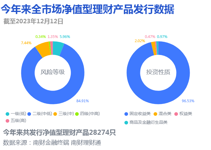 据南财理财通最新数据,截至2023年12月12日,今年来,全市场新发净值型银行理财产品28,274只(含私募产品)。