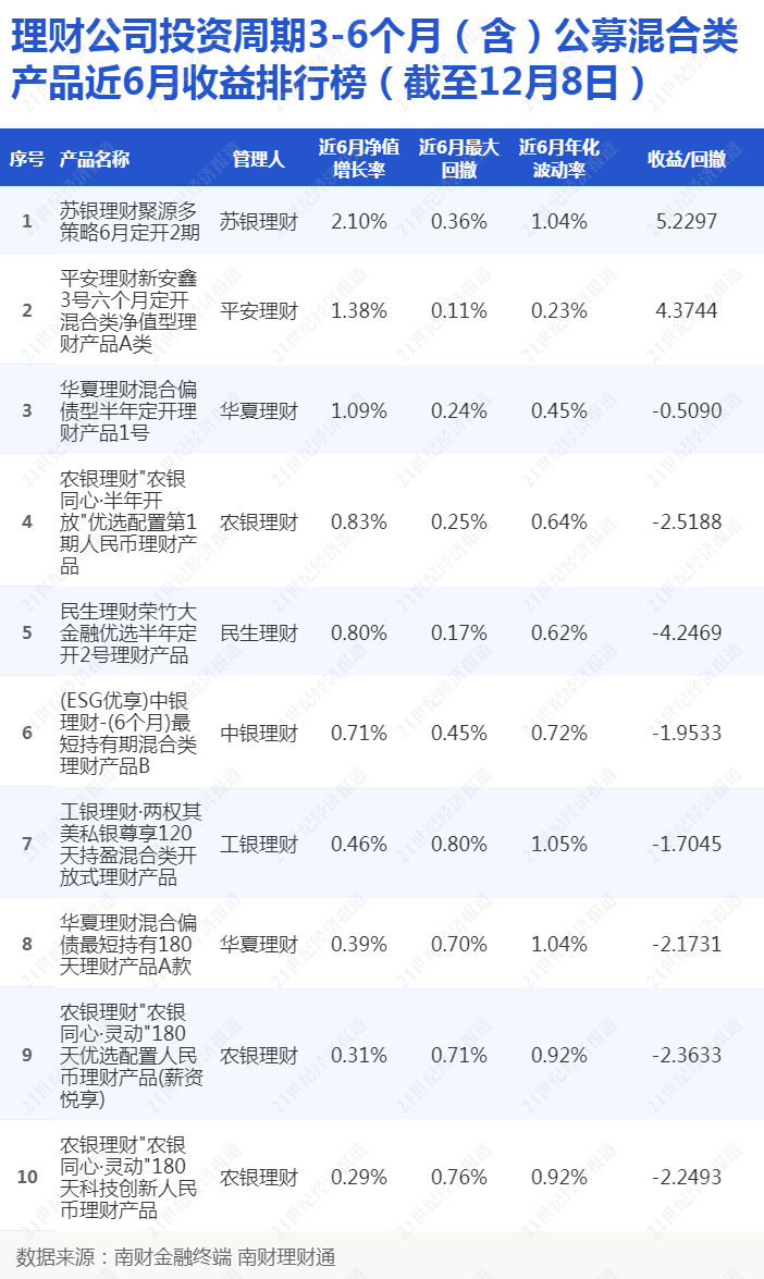 从收益角度看,苏银理财“聚源多策略6月定开2期”近6个月净值增长率2.10%摘榜单冠军,平安理财“新安鑫3号六个月定开混合类净值型理财产品A类”和华夏理财“混合偏债型半年定开理财产品1号”近6个月净值增长率分别为1.38%和1.09%,位列本期榜单第二名和第三名。