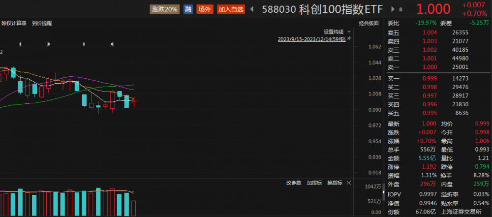 科创100指数ETF(588030)午间收涨0.70%,盘中溢价交易,成交额5.55亿元,近10个交易日“吸金”(资金净流入)12.8亿元。