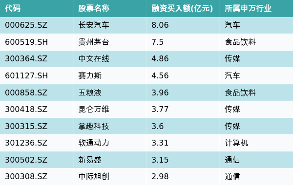 12月13日,两市共有3312只个股有融资资金买入,其中长安汽车、贵州茅台、中文在线排名前三,买入金额分别8.06亿元、7.5亿元、4.86亿元。融资买入额前10个股详情见下表: