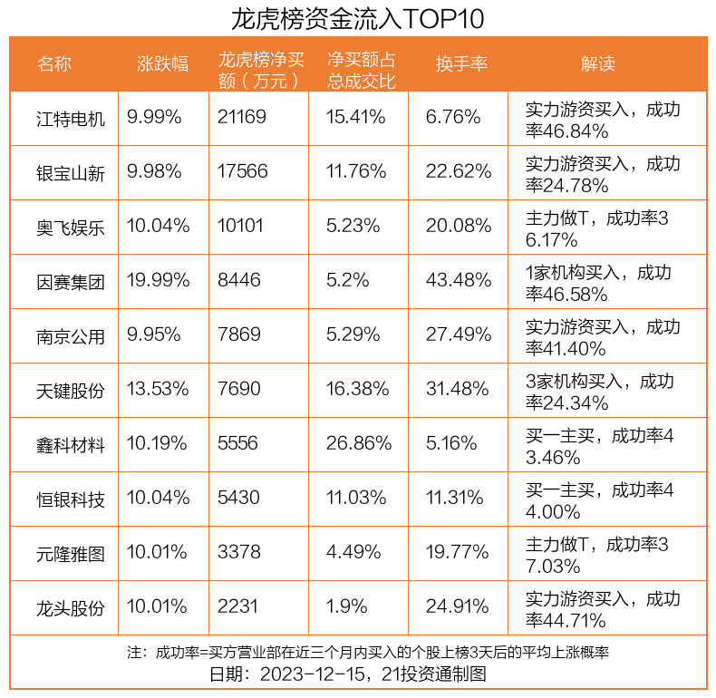 12月15日,上证指数下跌0.56%,深证成指下跌0.35%,创业板指下跌0.65%。盘后龙虎榜数据显示,共有36只个股因当日异动登上龙虎榜,资金净流入最多的是江特电机(002176.SZ),达2.12亿元。