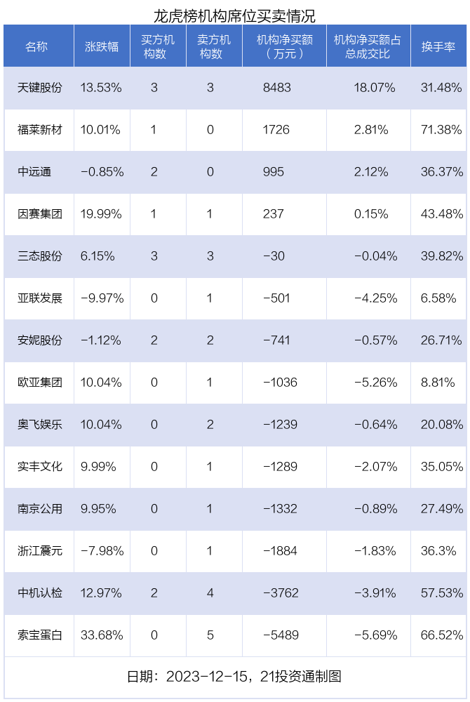 其中,机构净买入金额最多的是天键股份(301383.SZ),当日收盘上涨13.53%,换手率为31.48%。