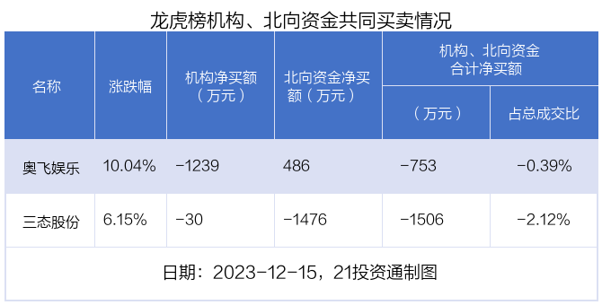 值得注意的是,机构和北向资金共同净卖出了三态股份;在奥飞娱乐上出现分歧,机构净卖出奥飞娱乐1238.97万元,北向资金净买入485.59万元。