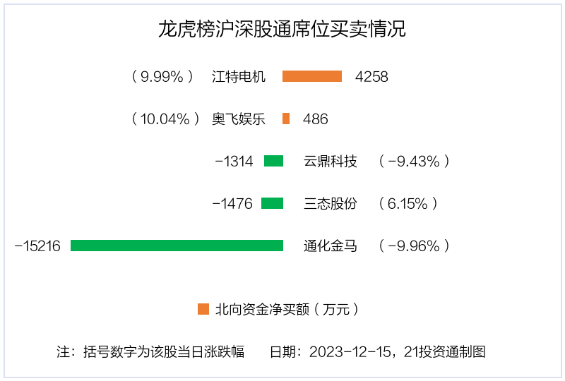 12月15日,北向资金参与龙虎榜中的个股共有5只,合计净卖出1.33亿元。其中深股通净买入2股,净卖出3股,合计净卖出1.33亿元。