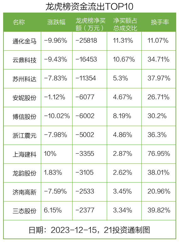 而龙虎榜中资金净流出最多的是通化金马(000766.SZ),被净卖出为2.58亿元,占总成交金额的11.31%。通化金马收盘下跌9.96%,换手率为11.07%。