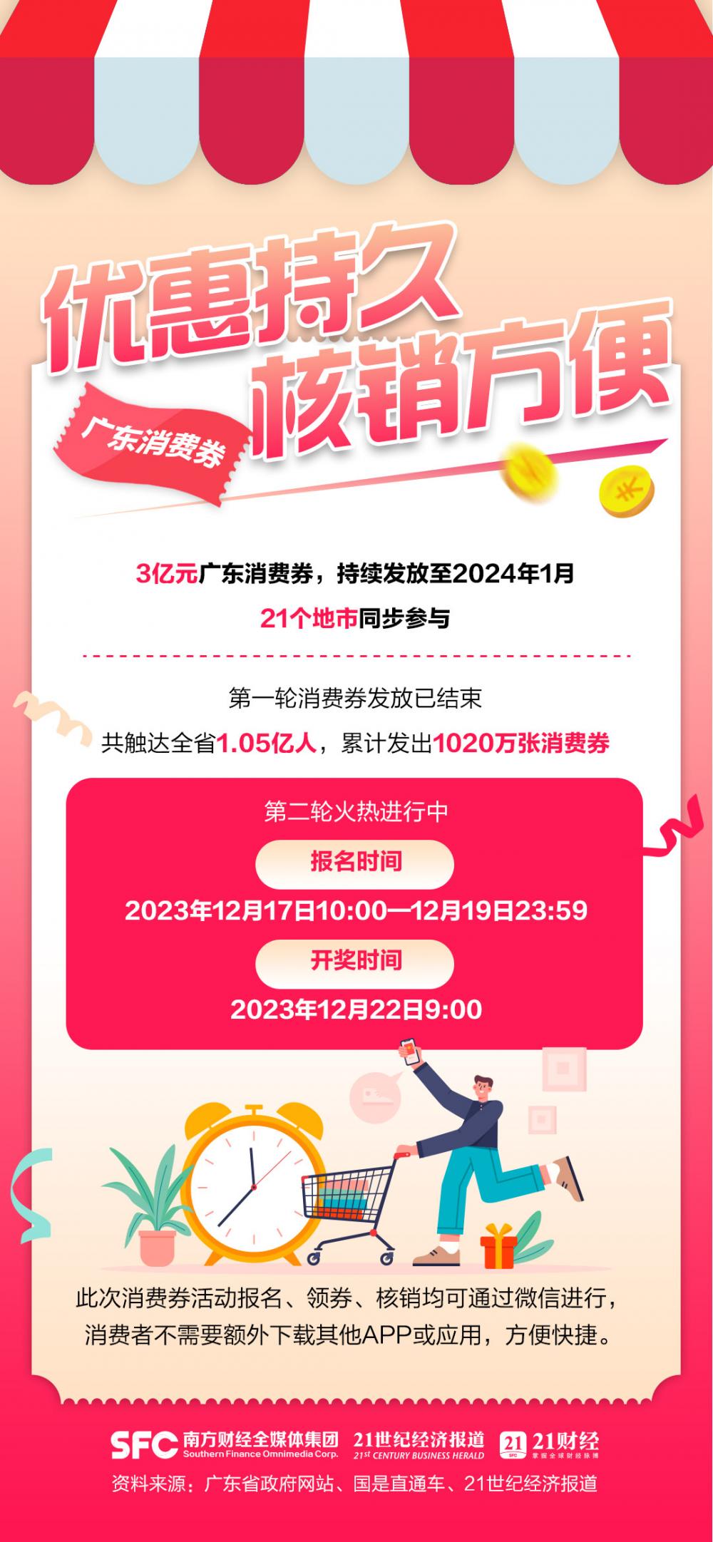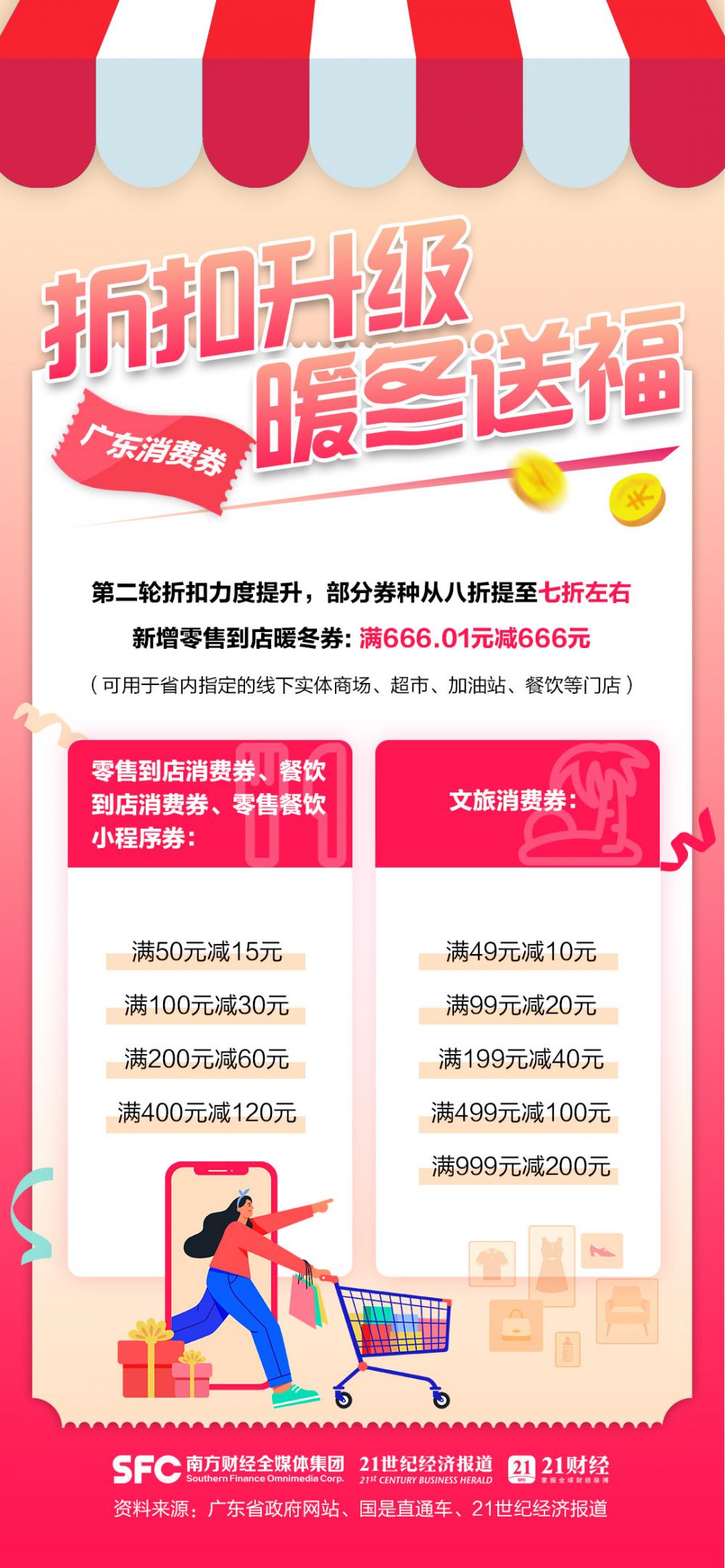 广东“粤消费 粤精彩”消费券第二轮预约报名已正式启动。第一轮已报名的消费者自动进入第二轮!第二轮活动折扣更高,还特别新增666元“暖冬券”,用大面额、大优惠的惊喜豪礼,温暖广东气温骤降的冬天。