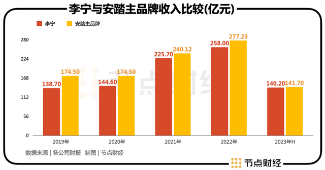 不过李宁虽然挤身三甲,但它与安踏及耐克的差距依然很大。2022年,安踏、耐克(大中华区)的营收分别为536.5亿元与514.2亿元,李宁的收入为258亿元。