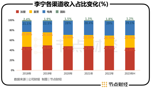《节点财经》认为,“直营店占比的不足也是本次拖累李宁整体流水降至中单位数”的一个重要因素。