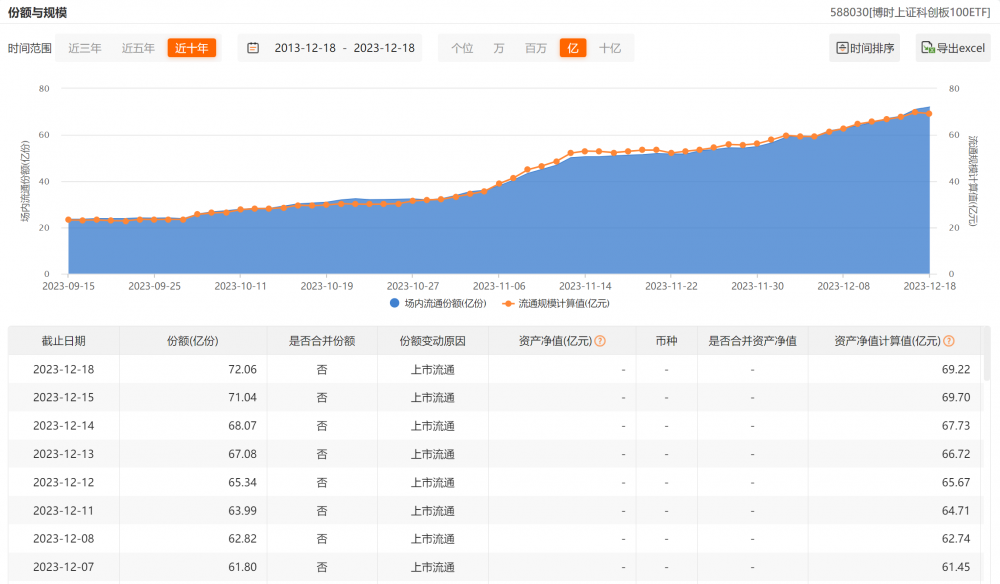 12月以来(截至12月18日),科创100指数ETF(588030)份额增长17.07亿份,规模增加13.03亿元。截至12月18日,最新份额为72.06亿份,最新规模为69.22亿元。