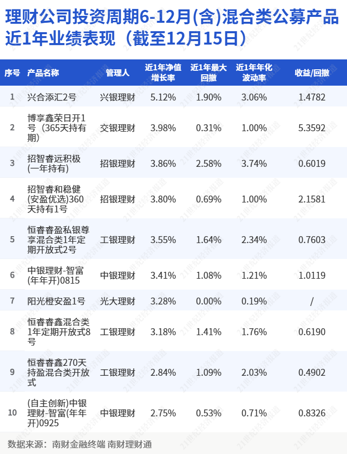 南财理财通数据显示,截至12月15日,在理财公司投资周期为6-12个月(含)的混合类公募产品近1年收益排行榜中,6家理财公司产品上榜。其中,工银理财有3只产品上榜,招银理财和中银理财各上榜2只产品,兴银理财、交银理财和光大理财各有1只产品上榜。