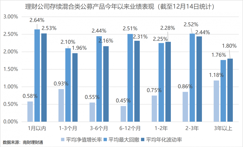 从混合类公募产品今年以来表现看,截至2023年12月14日统计,混合类公募产品今年以来平均净值增长率、平均最大回撤和平均年化波动率分别为0.73%、2.42%和2.33%,整体收益相对稳健。