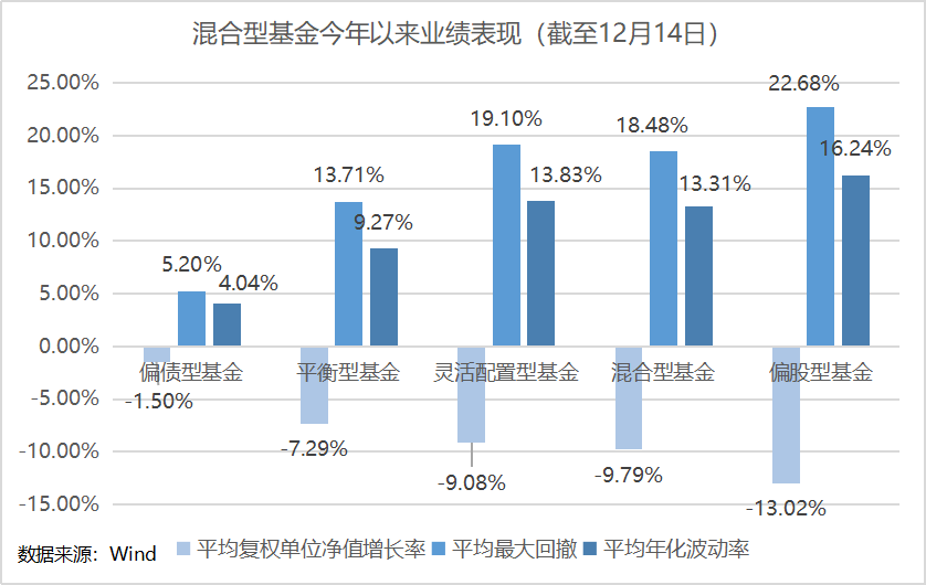 相较之下,混合型公募基金今年来收益波动和回撤幅度更大。截至12月14日,Wind数据显示,混合型基金算术平均复权单位净值增长率、平均年化波动率和平均最大回撤分别为-9.79%、13.31%、18.48%。具体来看,偏股型基金受A股市场表现弱势影响,今年以来下跌幅度达到13.02%,其最大回撤也超过20%,影响了混合型基金的整体表现。偏债型基金和混合类银行理财产品风险收益特征较为接近,不过混合类银行理财产品仍相比更优,在录得正收益的情况下其回撤和波动亦更低。