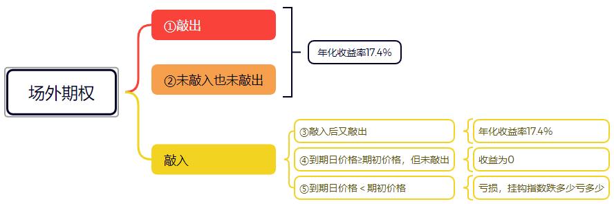 可以看到只要发生敲出或者未敲入也未敲出,投资者就可以获得年化收益率17.4%,但如果跌破“下限”发生敲入就危险了,只要此后不发生敲出,收益率将为0或者亏损,亏损幅度为挂钩标的恒生科技指数的跌幅。
