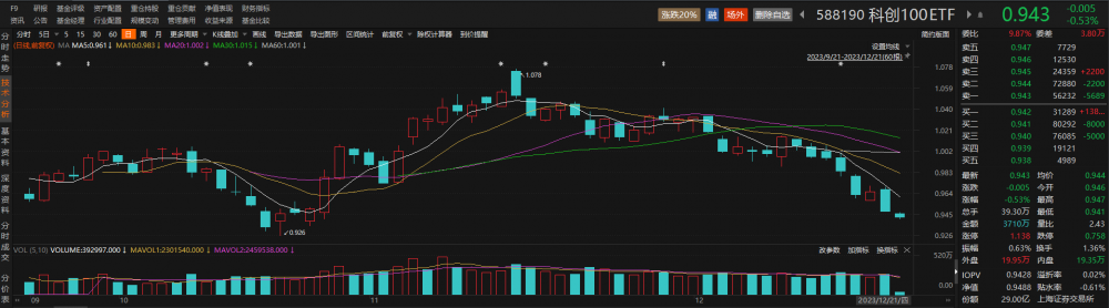 跟踪科创100指数的科创100ETF(588190)盘初下跌,但盘中现小幅溢价。截至发稿,该ETF下跌0.53%,溢折率为0.02%,成交金额超3700万元。