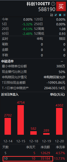 值得注意的是,科创100ETF(588190)近期持续获资金青睐,该ETF连续10个交易日获资金净流入,累计“吸金”超3.5亿元。