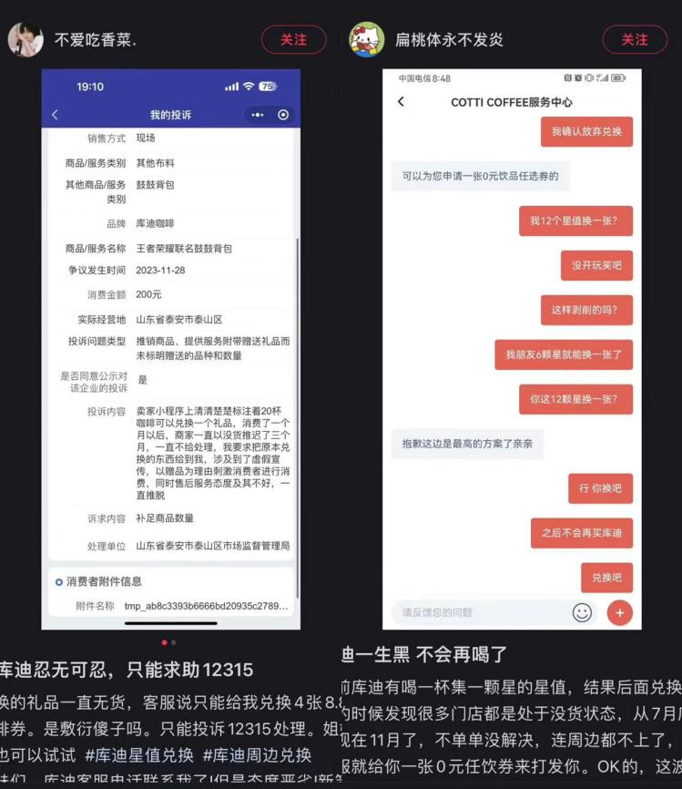 有人因为兑换的礼品一直无货,气得投诉12315,也有人不满客服对周边缺货的处理,表示自己“库迪一生黑,不会再喝了。”