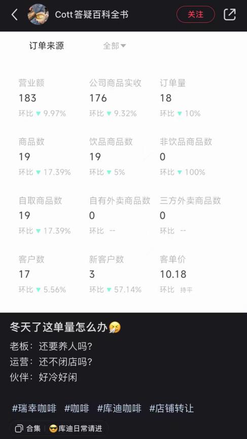 有业内人士观察到,夏季末开始,库迪日杯量已由巅峰时期的400杯跌至如今的100杯上下,甚至有联营商日订单数已不足20。由于日常运营所需的租房、人力成本并未减少,不少联营商都因“体力难支”不得已选择转让闭店。
