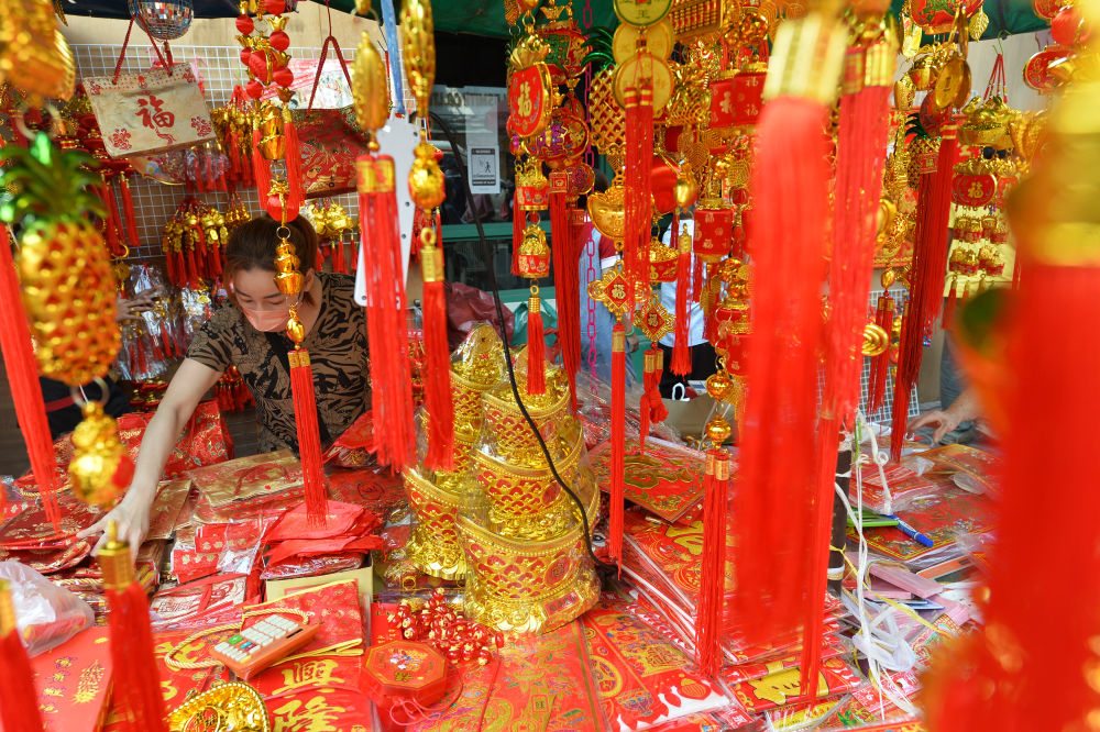 一名商贩在泰国曼谷唐人街的摊位上摆放春节饰品。新华社发(拉亨摄)