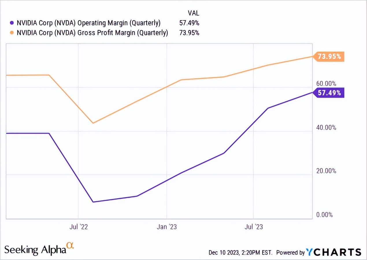 公司的利润率飙升至令人瞠目结舌的水平。上季度毛利率达到74%,营业利润率达到57%,如下图所示。