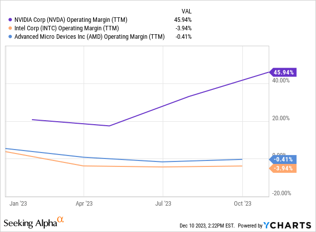 也许,当我们看看利润率时,Nvidia 相对于某些竞争对手的竞争优势最为明显。以下是过去 12 个月的营业利润率 (TTM)。