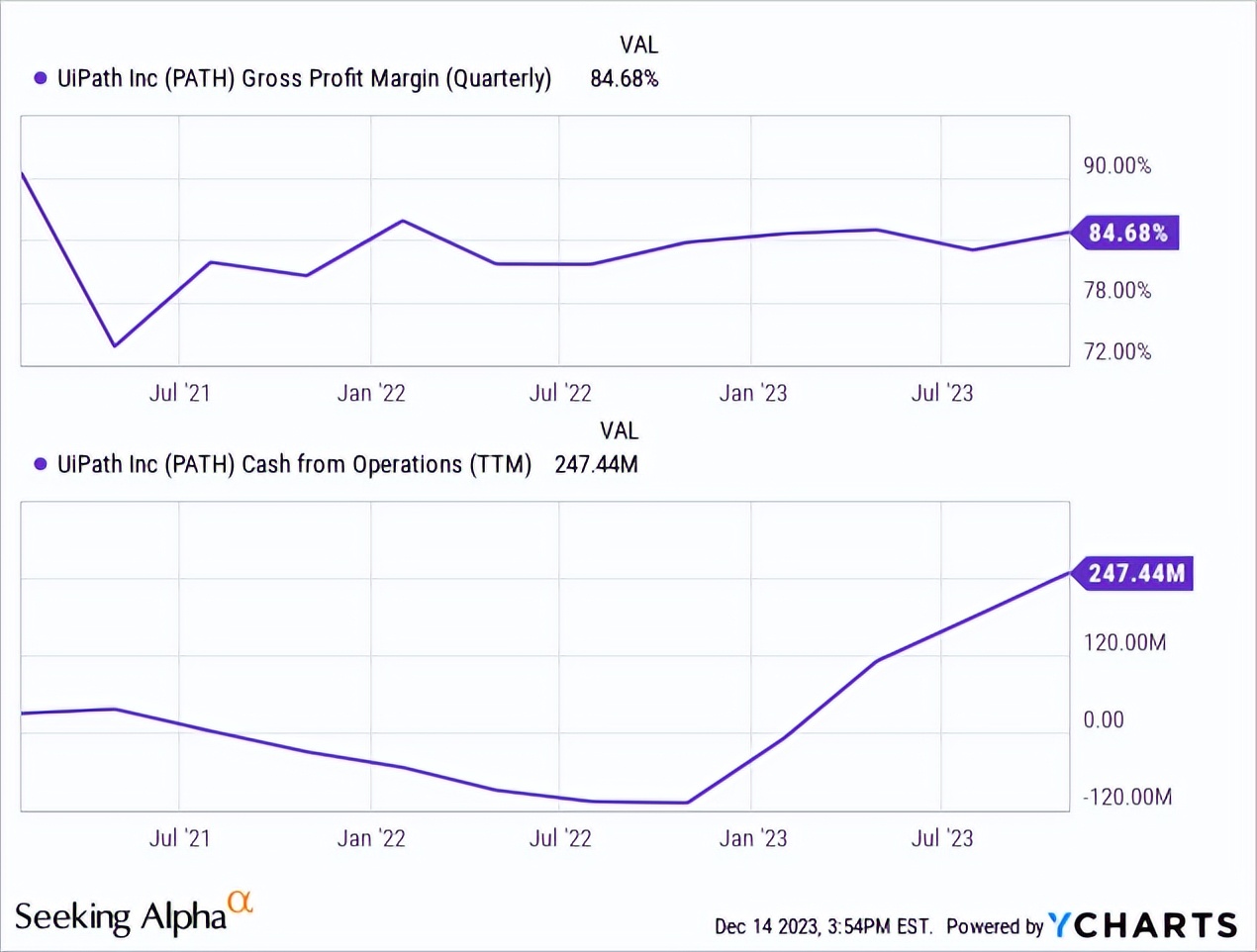 2023年第三季度,年度经常性收入 (ARR) 达到 14 亿美元,同比 (YOY) 增长 24%。UiPath 还报告称,以美元计算的净保留率 (DBNR) 超过 120%,表明客户重视该产品,并愿意支付更多费用或添加功能。