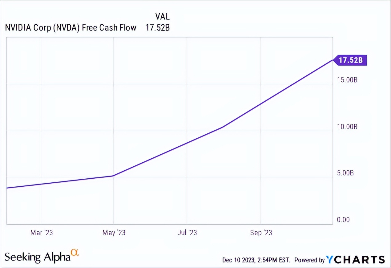 如果我不讨论 Nvidia 的现金流,那就太失职了,这是我最喜欢的关键绩效指标 (KPI)。到 2024 财年的前三个季度,自由现金流 (FCF) 已经比 2023 财年增长了 400%,比 TTM 增长了 175 亿美元,如下所示。