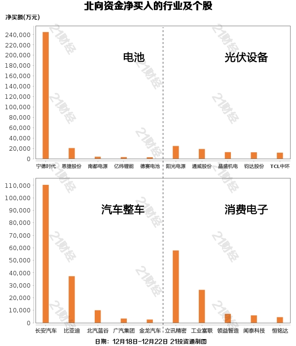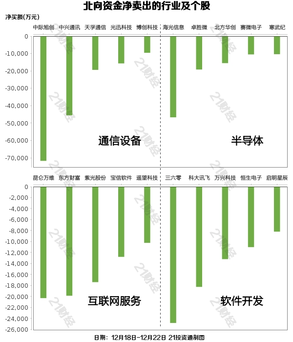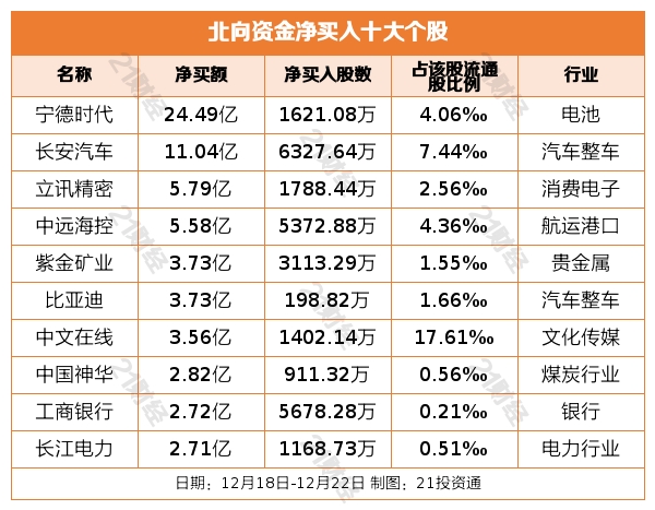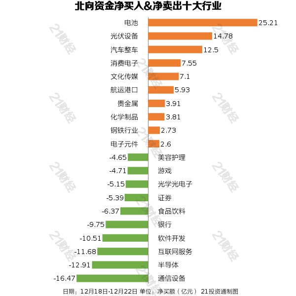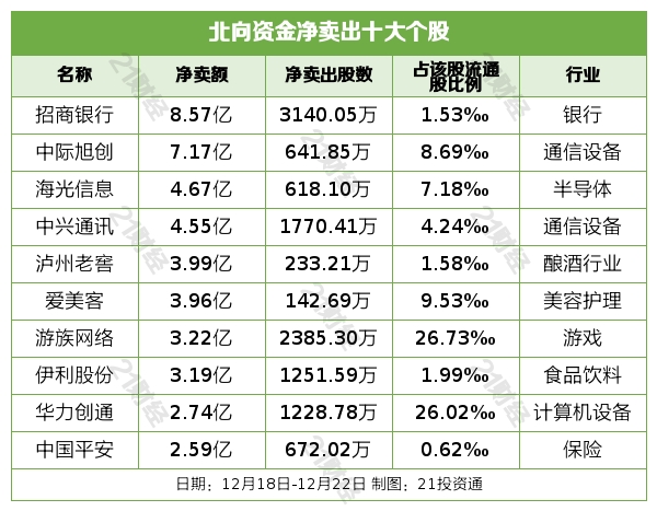 据21投资通智能监测,12月18日-12月22日,北向资金净卖出22.36亿元,其中沪股通净卖出1.34亿元,深股通净卖出21.02亿元。