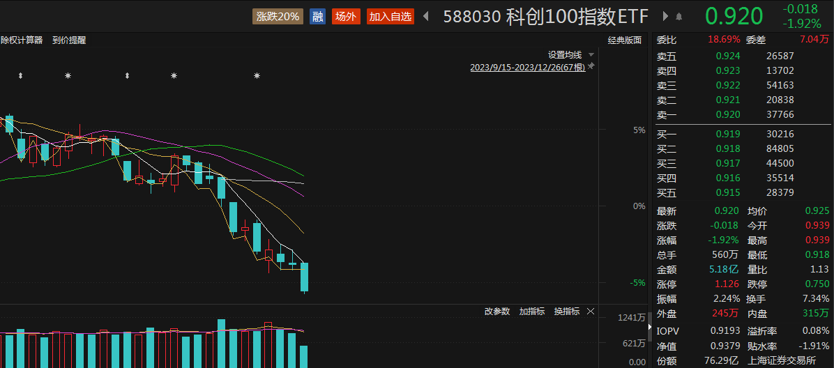 规模最大的跟踪科创100(000698)的ETF——科创100指数ETF(588030)跟随大市下跌,盘中价一度跌至0.918元,最后午间收跌1.92%,报0.920元,盘中溢价交易,半日成交额5.18亿元,换手率7.34%,盘中交投活跃。