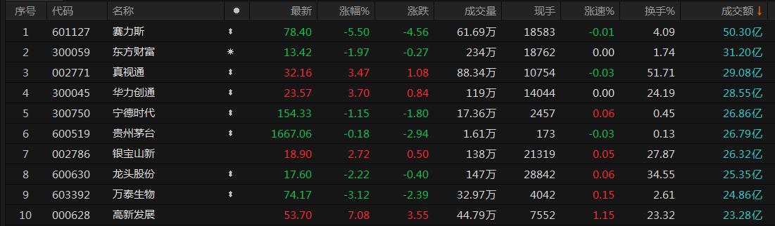 个股方面,赛力斯成交额居首,为50.30亿元。其次是东方财富、真视通、华力创通、宁德时代,成交额分别为31.20亿元、29.08亿元、28.55亿元、26.86亿元。