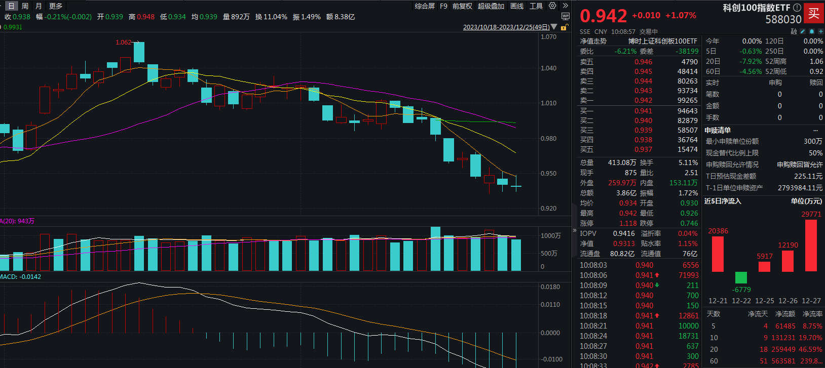规模最大的跟踪科创100(000698)的ETF——科创100指数ETF(588030)今日早盘低开震荡,现由跌翻红,涨1.07%,成交额3.86亿元。