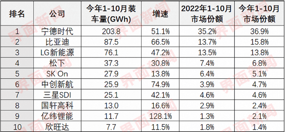 其中,比亚迪与宁德时代之间的差距正在不断缩小,今年前十个月,宁德时代的市占下降了近10%,而比亚迪则上升了近12%,这也意味着车企的“去宁化”已产生了明显的效果。