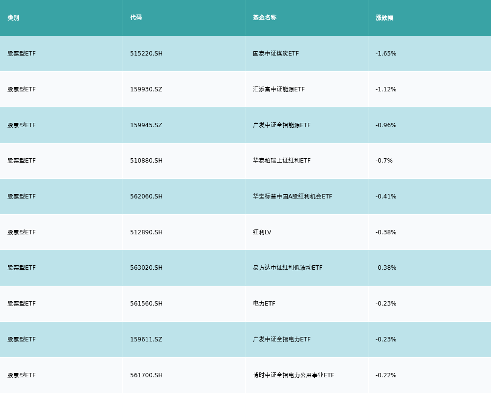12月28日,股票型ETF跌幅最大的3支ETF及其收益率分别为:国泰中证煤炭ETF(-1.65%)、汇添富中证能源ETF(-1.12%)、广发中证全指能源ETF(-0.96%)。跌幅前10详情见下表: