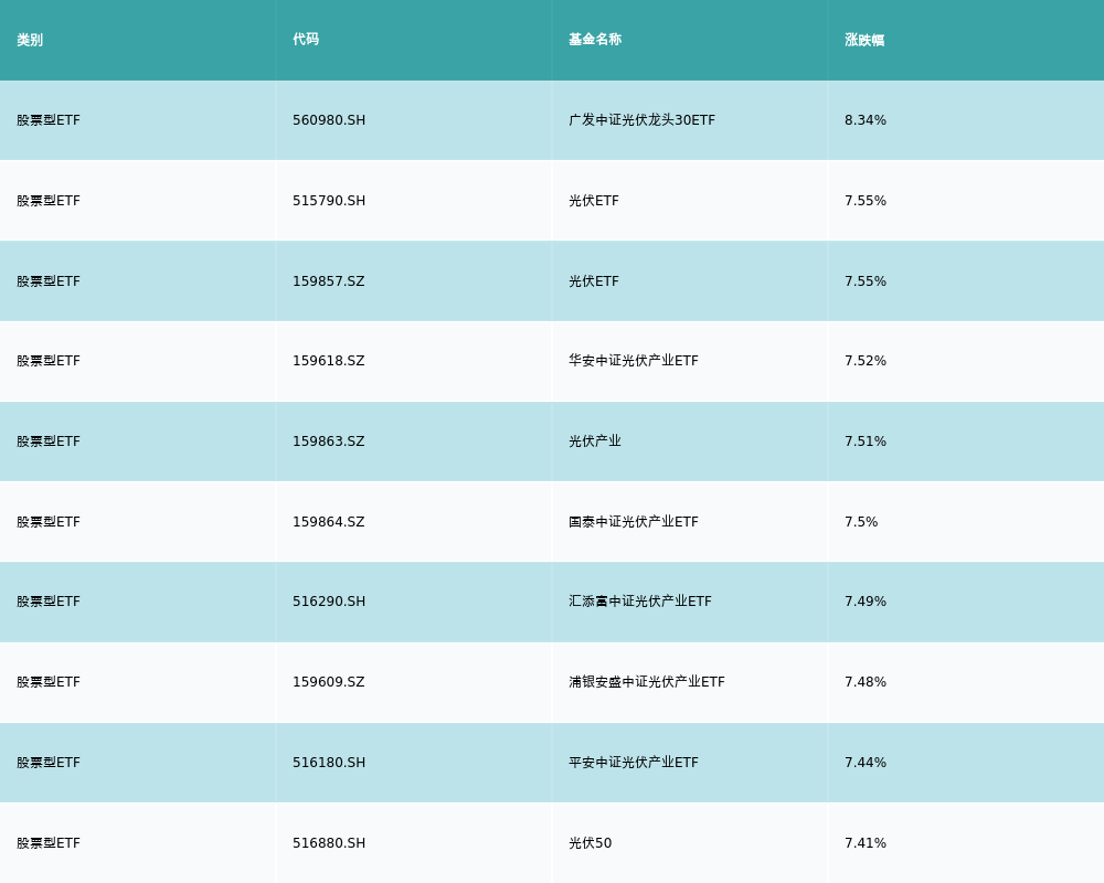 12月28日,股票型ETF涨幅最高的3支ETF及其收益率分别为:广发中证光伏龙头30ETF(8.34%)、光伏ETF(7.55%)、光伏ETF(7.55%)。涨幅前10详情见下表: