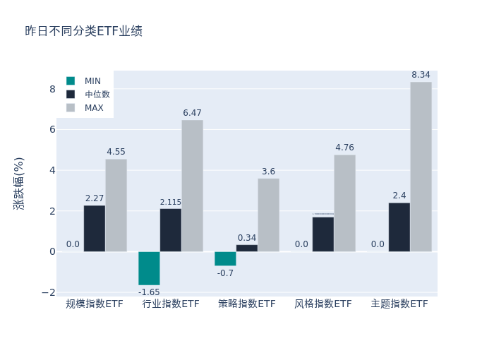 12月28日,股票型ETF收益率中位数为2.26%。其中按照不同分类,规模指数中华安创业板50ETF收益率最高,为4.55%;行业指数中南方中证新能源ETF收益率最高,为6.47%;策略指数中质量ETF收益率最高,为3.6%;风格指数中大成深证成长40ETF收益率最高,为4.76%;主题指数中广发中证光伏龙头30ETF收益率最高,为8.34%。