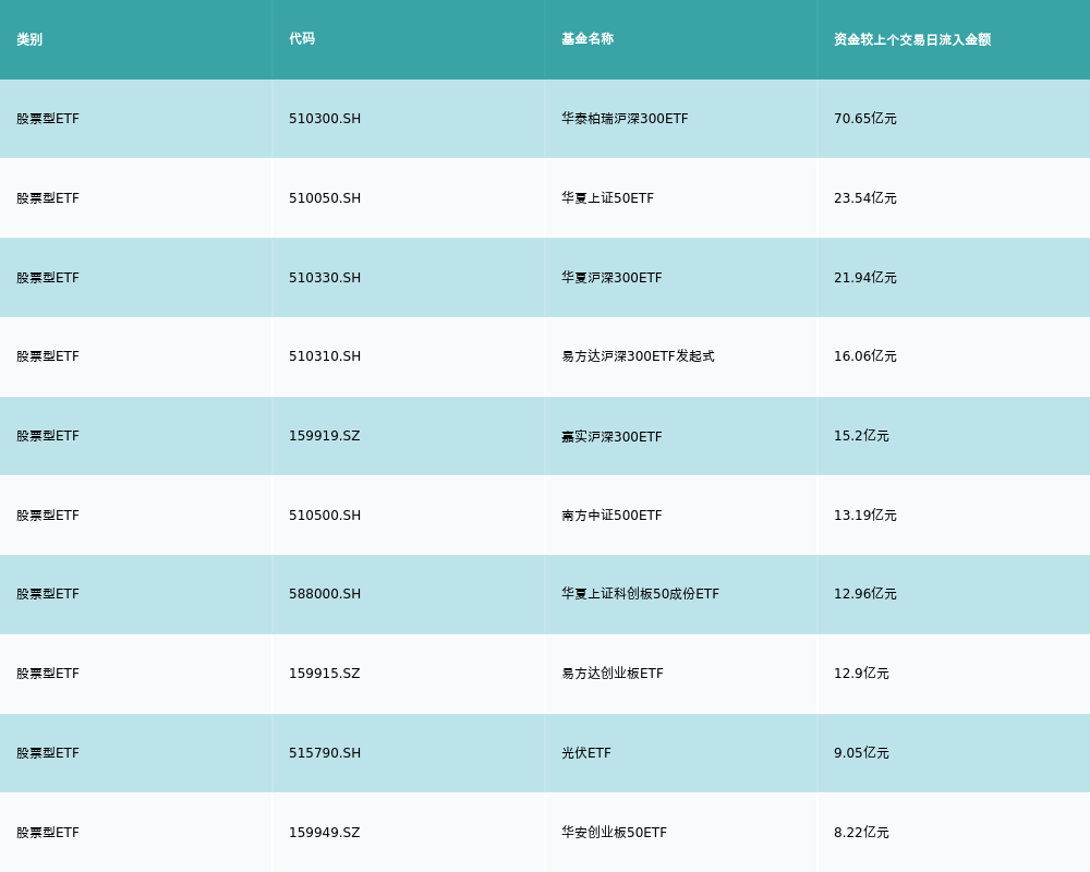 12月28日,股票型ETF资金流入最多的3支ETF及其流入金额分别为:华泰柏瑞沪深300ETF(流入70.65亿元)、华夏上证50ETF(流入23.54亿元)、华夏沪深300ETF(流入21.94亿元)。资金流入前10详情见下表: