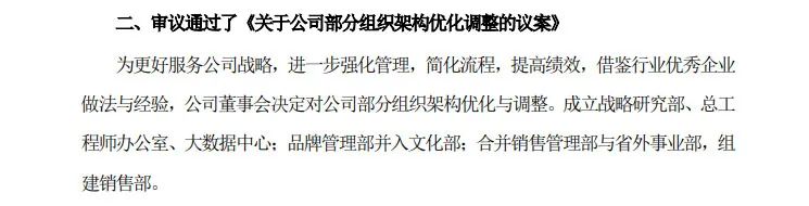 7月,今世缘公告,成立战略研究部、总工程师办公室、大数据中心;品牌管理部并入文化部;销售管理部与省外事业部合并,组建销售部。