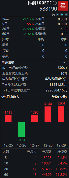 值得注意的是,科创100ETF(588190)在近20个交易日中有17日获资金净流入,累计“吸金”近5.15亿元,最新份额达30.35亿份,续创上市以来新高。