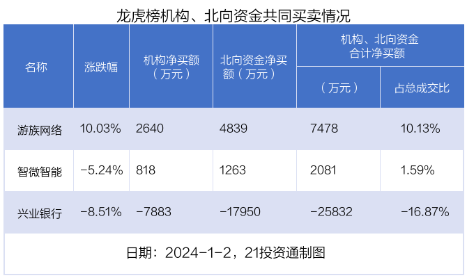 值得注意的是,机构和北向资金共同净买入了游族网络、智微智能等2股;共同净卖出了兴业银行。