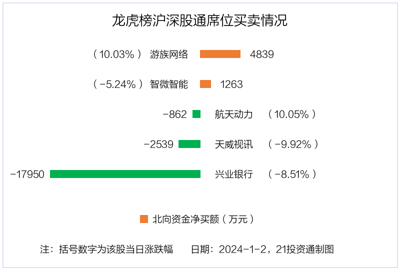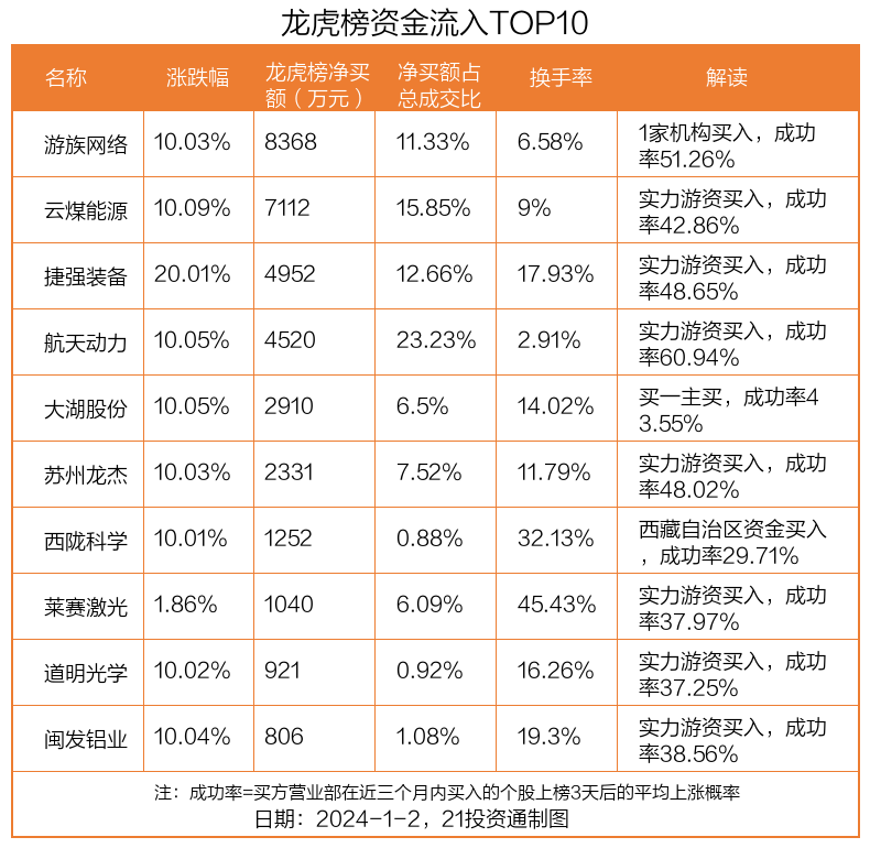 1月2日,上证指数下跌0.43%,深证成指下跌1.29%,创业板指下跌1.87%。盘后龙虎榜数据显示,共有44只个股因当日异动登上龙虎榜,资金净流入最多的是游族网络(002174.SZ),达0.84亿元。