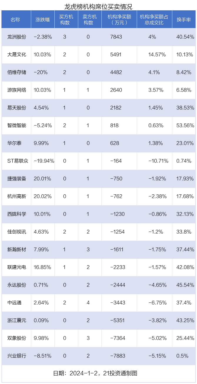 1月2日,19只个股龙虎榜出现了机构的身影,机构合计净卖出1.04亿元。具体来看,机构净买入7股,净卖出12股。