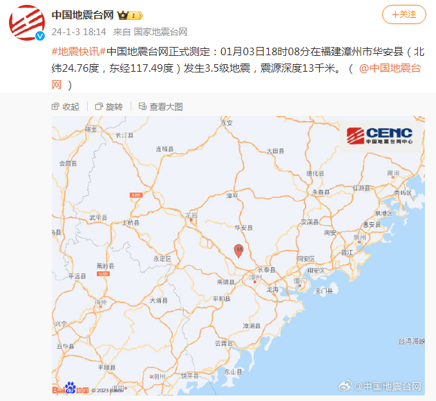 中国地震台网正式测定:01月03日18时08分在福建漳州市华安县(北纬24.76度,东经117.49度)发生3.5级地震,震源深度13千米。