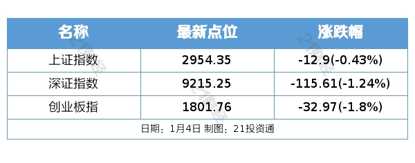 1月4日,大盘全天震荡分化,沪指午后有所回升,创业板指领跌。截至收盘,沪指跌0.43%,深成指跌1.24%,创业板指跌1.8%。指数黄白分时线走势分化,题材股相对活跃。盘面上,旅游、冰雪产业概念股逆势大涨。鸿蒙概念股盘中活跃,供销社概念股开盘走高。下跌方面,MR概念股持续调整。总体上个股跌多涨少,全市场3200只个股下跌。沪深两市全天成交额6734亿,较上个交易日缩量641亿。
