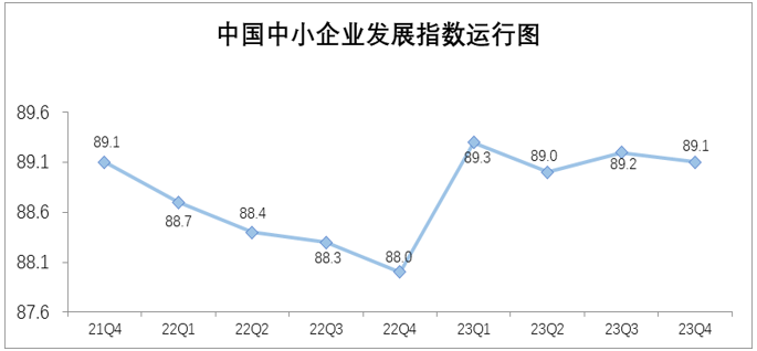 不过,临近年末,中小企业发展情况再次呈现下行趋势。2023年12月份中小企业发展指数为89.0,比上月下降0.3点,四季度指数为89.1,比上季度微降0.1点。