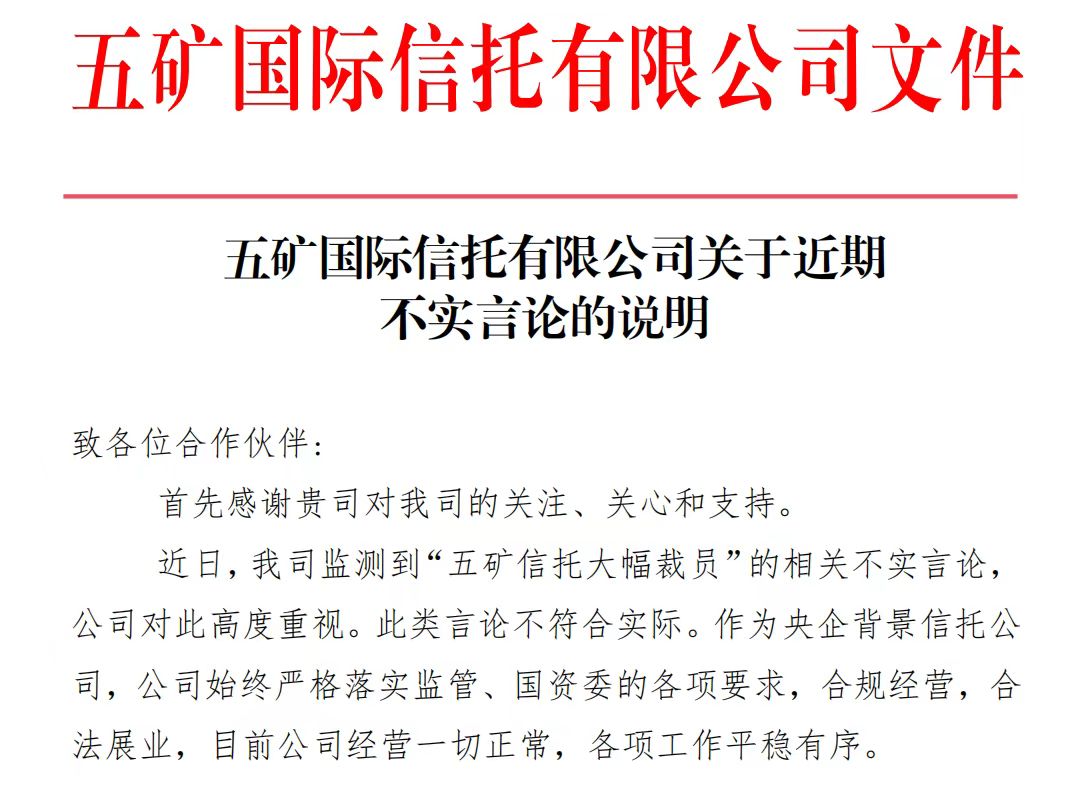 对此,五矿信托方面人士向记者作出了回应。五矿信托表示,近日监测到“五矿信托大幅裁员”的相关不实言论,公司对此高度重视。此类言论不客观。作为央企背景信托公司,公司始终严格落实监管、国资委的各项要求,合规经营,合法展业,目前公司经营一切正常,各项工作平稳有序。