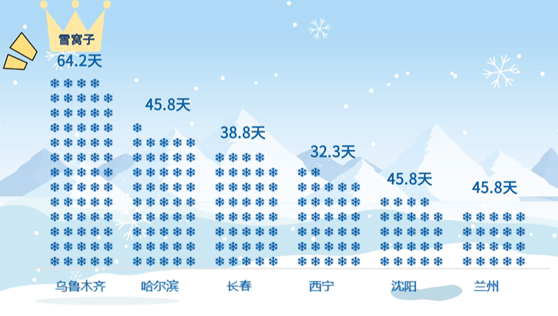 从年均降雪日来看,在全国31个主要城市中,乌鲁木齐以年均降雪64.2天遥遥领先,算得上是大城市中的雪窝子之首。