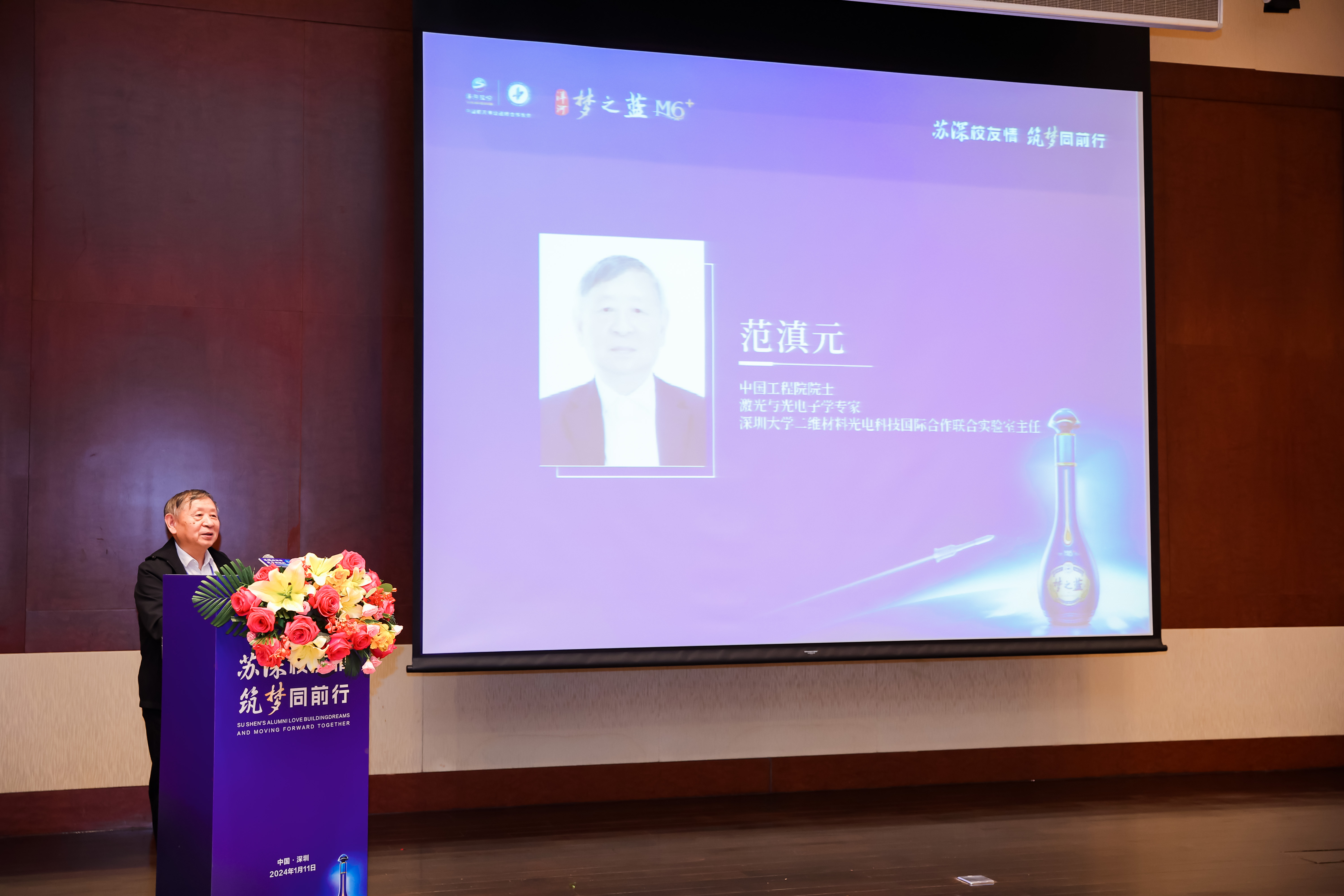 会上,中国工程院院士、激光与光电子学专家、深圳大学二维材料光电科技国际合作联合实验室主任范滇元和美国医学与生物工程院院士、俄罗斯工程院外籍院士、深圳理工大学计算机科学与控制工程学院创院院长潘毅出席活动并致辞。范滇元院士深情回顾了自己在常熟市中学、北京大学、中国科学院电子学研究所的求学经历。他感到,苏粤两省作为经济大省强省,肩负挑大梁走在前的光荣使命,苏粤合作发展兼具天时地利人和,大有可为,前景广阔。